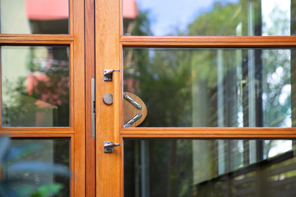 BESKRIVNING: Utåtgående massiv pardörr med linjerande glaslister och droppnäsor. Glasbrytande spröjs. Rostfri sparkplåt. Draghandtag utsida Krom 1433 inoljad ek. Insida Tryckplatta Krom 1428 inoljad ek.
