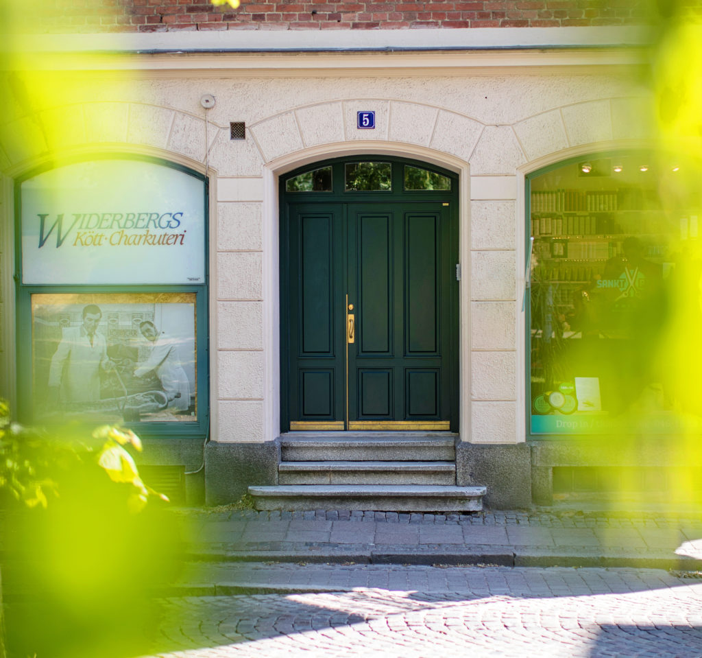BESKRIVNING: Massiva furudörrar med integrerad tvärpost och renoverad kröningslist. Inåtgående med specialtillverkade brytskydd och sparkplåtar i mässing. Draghandtag Jugend VI.